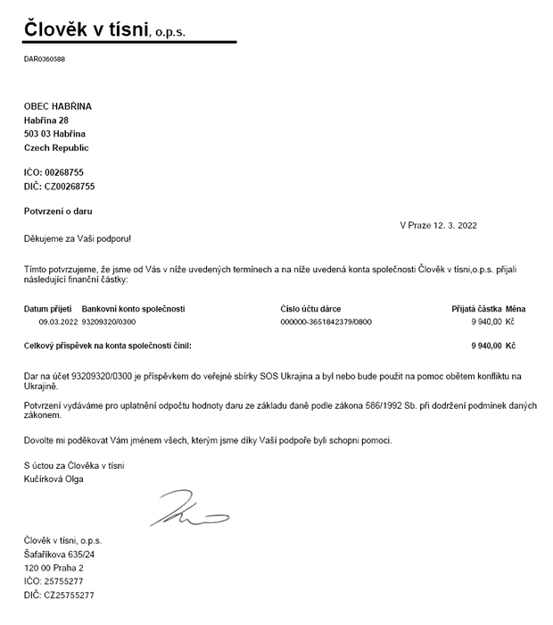 Úvod > Obec > Aktuality > Potvrzení o přijetí daru od obce