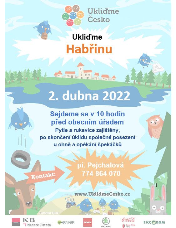 V sobotu 2.4 se naše obec připojí akcí UKLIĎME HABŘINU k celorepublikové akcí UKLIĎME ČESKO. Prosím účastníky ať se dostaví v sobotu 2.4. v 10 hod před obecní úřad, kde dostanou pracovní rukavice a sběrné pytle. Po ukončení úklidu bude připraveno pro účastníky opékání špekáčků u obecní hospody.